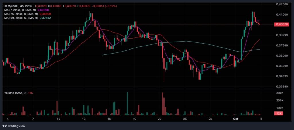 Kenaikan cepat dari akhir September mendorong XLM tembus di atas $0,38–0,39, dengan dorongan volume tinggi. Saat ini harga sedang konsolidasi di sekitar $0,40 setelah sempat menyentuh $0,41.