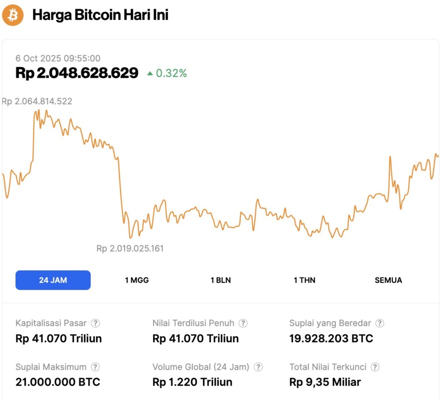 Pada 6 Oktober 2025, harga Bitcoin tercatat berada di level $124,143 atau setara dengan Rp2.048.628.629, mengalami kenaikan 0,32% dalam 24 jam terakhir. Sepanjang periode ini, BTC menyentuh level terendahnya di Rp2.019.025.161 dan harga tertingginya di Rp2.064.814.522.