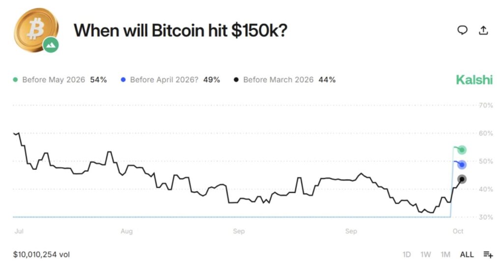 Namun, tidak semua pasar bersikap seoptimis itu. Berdasarkan data dari platform prediksi Kalshi, para trader memperkirakan peluang Bitcoin menembus level $150.000 masih terbatas: hanya 44% kemungkinan sebelum Maret 2026, naik menjadi 49% sebelum April 2026, dan 54% sebelum Mei 2026.