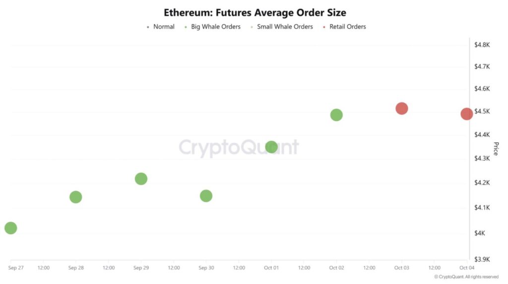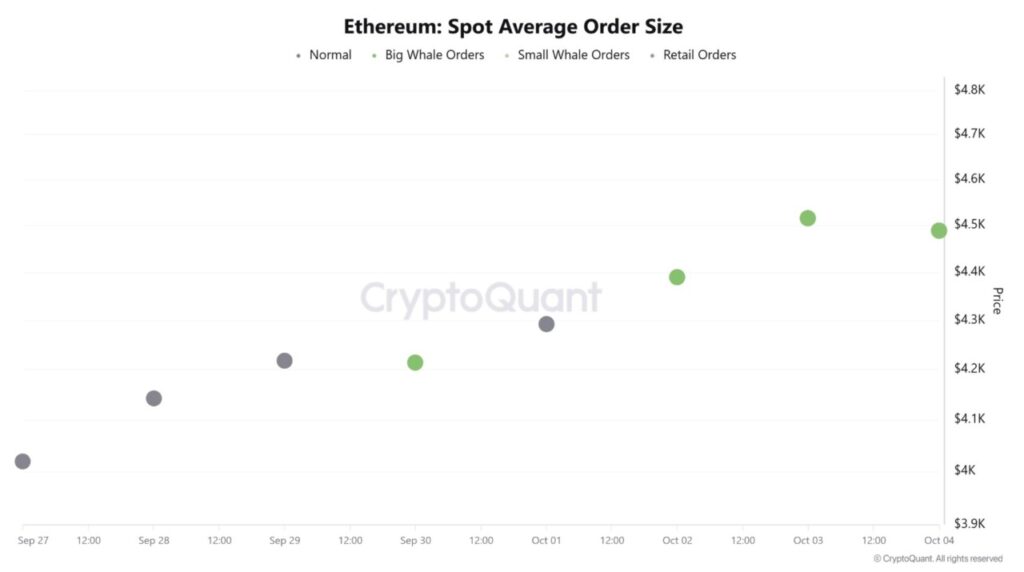 Setelah pasar sempat pulih, para whale langsung kembali aktif. Data Spot Average Order Size menunjukkan adanya pesanan besar dari whale selama tiga hari berturut-turut. Dalam sepekan terakhir, Ethereum mencatat aktivitas order besar dari whale pada empat dari tujuh hari perdagangan. Biasanya, peningkatan aktivitas whale menandakan keterlibatan lebih tinggi dari investor institusional.