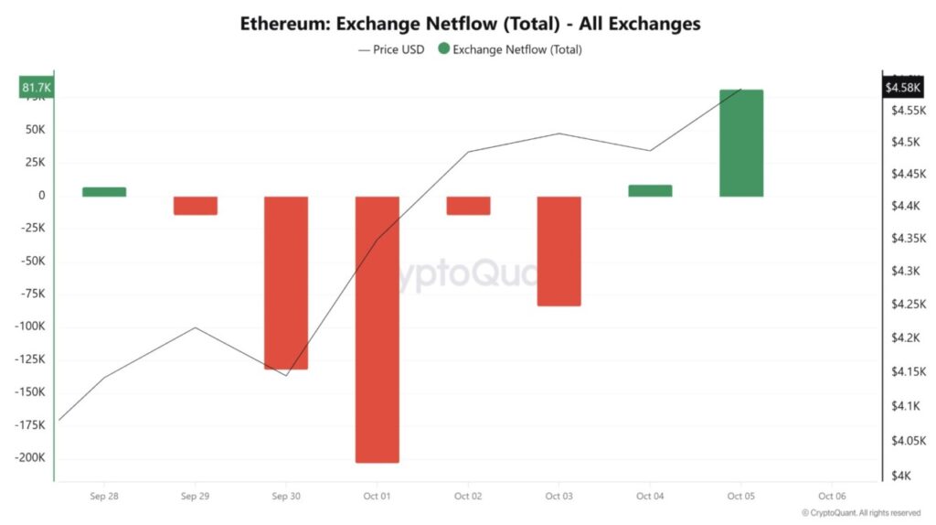 Pada saat artikel ini ditulis, ETH diperdagangkan di level $4.540, naik sekitar 0,21% dalam grafik harian (6/10). Namun, pertanyaannya — mengapa ETH masih tampak kesulitan untuk menembus level harga berikutnya?
