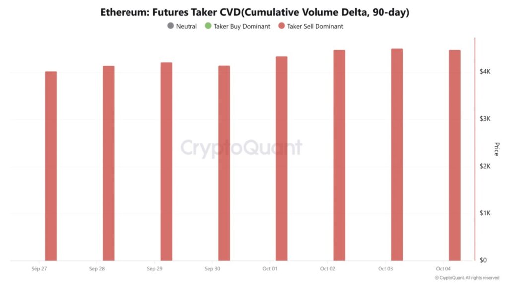 Hal ini juga diperkuat oleh data Futures Taker CVD dari CryptoQuant yang menunjukkan kondisi “Taker Sell Dominant”, yaitu ketika tekanan jual lebih tinggi daripada tekanan beli.