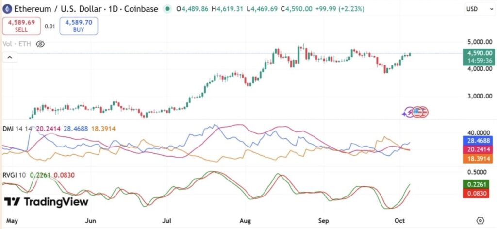 Menariknya, indikator Directional Movement Index (DMI) Ethereum melonjak dari 20 menjadi 28, menandakan momentum kenaikan yang semakin kuat. Sementara itu, Relative Vigor Index (RVGI) juga meningkat ke level 0,22, memperkuat sinyal pergerakan naik.