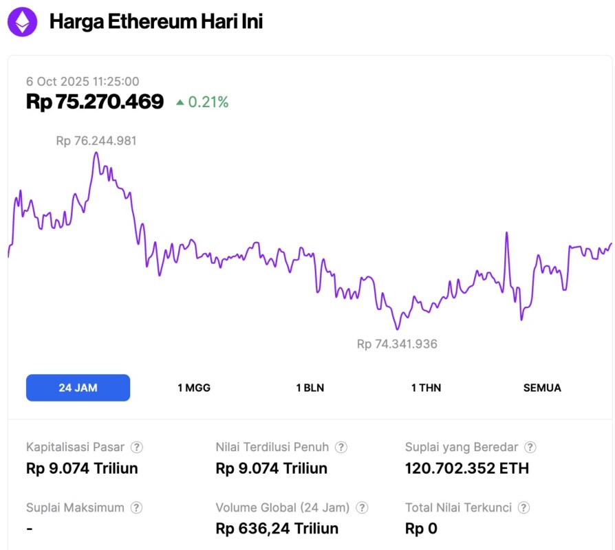 Pada 6 Oktober 2025, harga Ethereum tercatat berada di sekitar $4,540 atau setara dengan Rp75.270.469, mengalami kenaikan 0,21% dalam 24 jam terakhir. Sepanjang periode ini, ETH sempat menyentuh level terendahnya di Rp74.341.936, dan level tertingginya di Rp76.244.981.