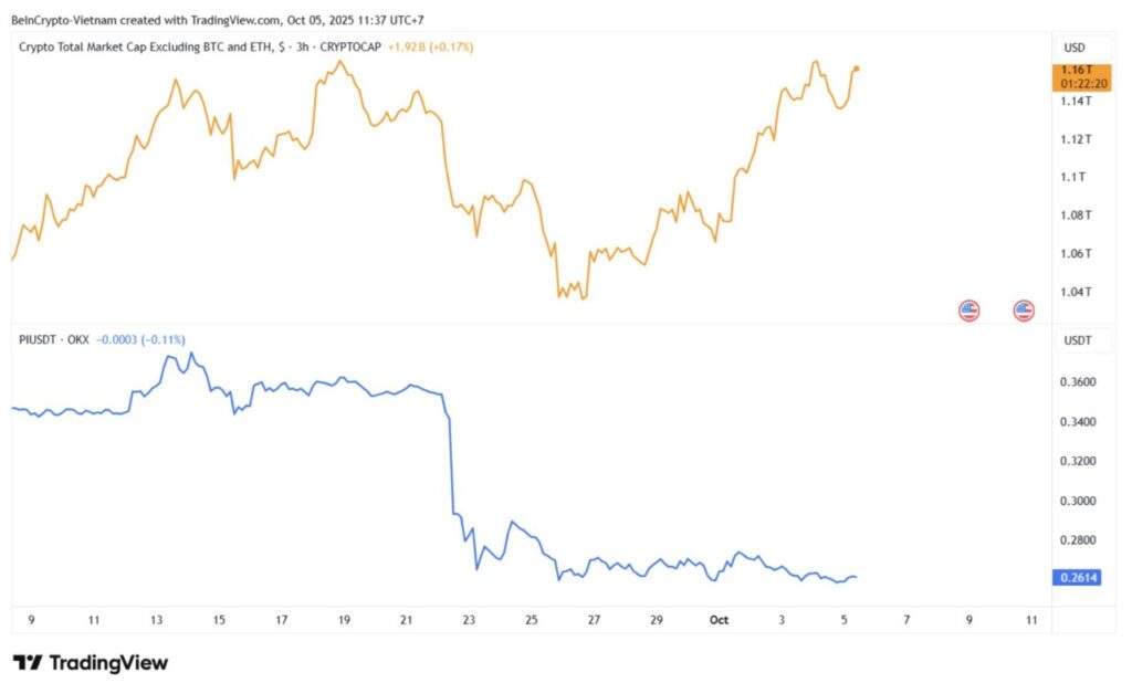 Sementara sebagian besar altcoin ikut menguat seiring reli Bitcoin, Pi justru bergerak berlawanan arah. Hal ini menunjukkan bahwa penurunan harga Pi lebih dipengaruhi oleh faktor internal jaringan, bukan sentimen pasar secara umum.