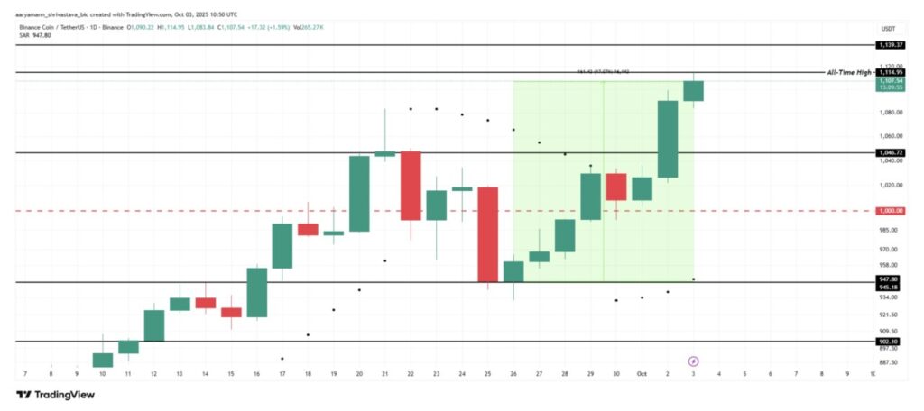 Reli ini juga mendorong BNB mencetak rekor tertinggi baru (all-time high) di level $1.114. Dari sisi teknikal, indikator seperti Parabolic SAR menunjukkan tren naik yang masih aktif.