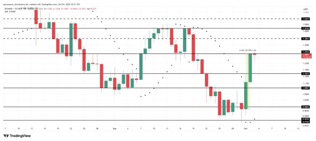 Jika reli berlanjut, SPX berpotensi menembus $1,39 dan menguji $1,47, yang akan menjadi level tertinggi dalam tiga minggu terakhir sekaligus menghapus sebagian kerugian sebelumnya ā meningkatkan kembali kepercayaan investor terhadap pemulihan token ini.