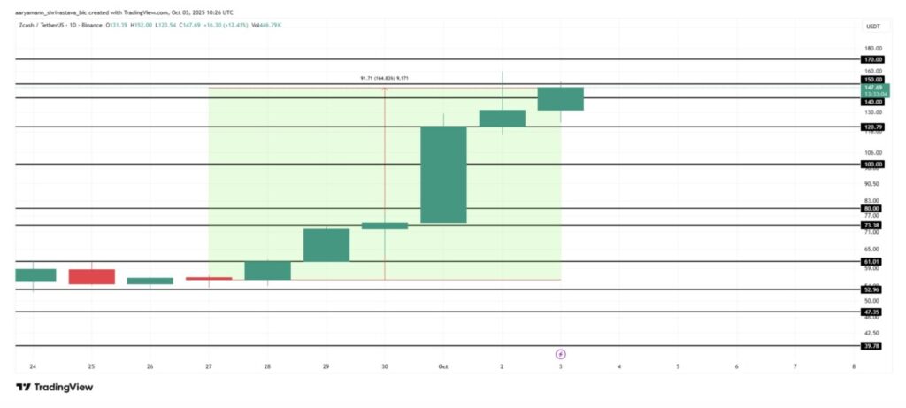Dengan momentum yang terus meningkat, ZEC kini membidik level resistansi $150 sebagai target berikutnya. Jika berhasil menembus $150, reli ZEC berpotensi berlanjut menuju $170. Kenaikan tajam ini telah membawa ZEC ke level tertinggi dalam tiga setengah tahun terakhir, memperkuat sentimen bullish di pasar.