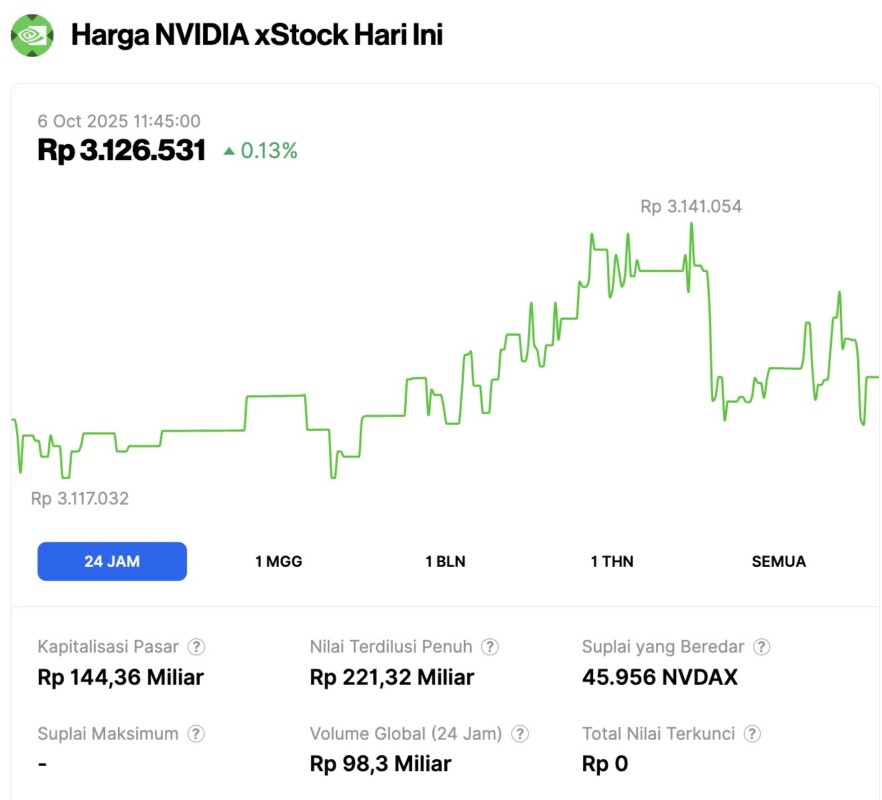 Dilansir dari Pintu Market, harga saham NVIDIA tertokenisasi dari xStock tengah mengalami kenaikan tipis 0,13%, dan di perdagangkan di sekitar Rp3.126.531 dalam waktu 24 jam. Berdasarkan chart yang ada, NVDAX sempat menyentuh titik terendahnya di Rp3.117.032 dan titik tertingginya di Rp3.141.054.