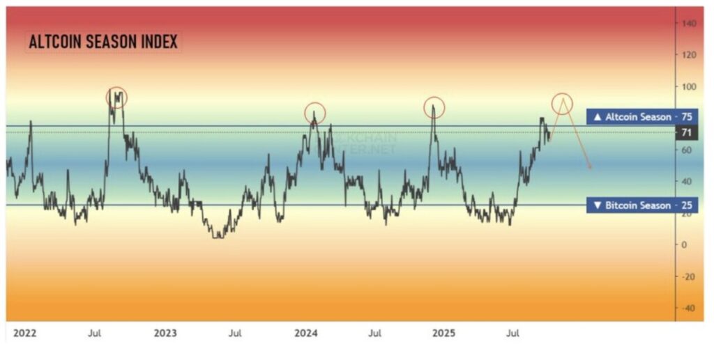 Secara historis, altcoin cenderung mengalami reli terbesar ketika Bitcoin mendekati puncaknya, dan pola yang sama tampaknya mulai terbentuk kembali kali ini.