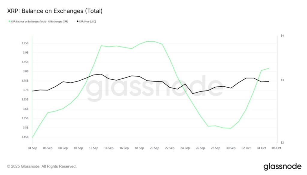 Saldo XRP di bursa mengalami peningkatan tajam, menandakan adanya aktivitas jual yang kuat. Dalam tujuh hari terakhir, sekitar 320 juta XRP senilai hampir $950 juta telah dipindahkan ke berbagai platform perdagangan.