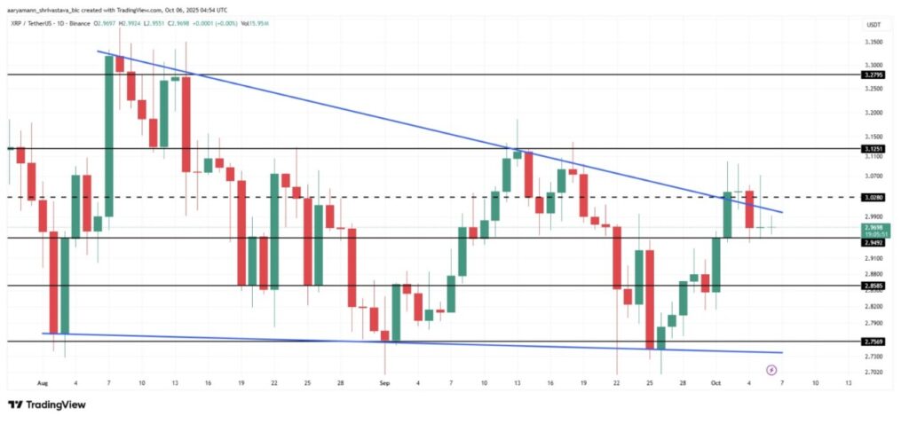 Pada 6 Oktober, XRP sempat diperdagangkan di kisaran $2,96, bertahan sedikit di atas level support $2,94. Altcoin ini sebelumnya menunjukkan potensi untuk menembus pola descending wedge, namun upaya tersebut gagal untuk sementara waktu ā menandakan masih adanya tekanan pelemahan di pasar.