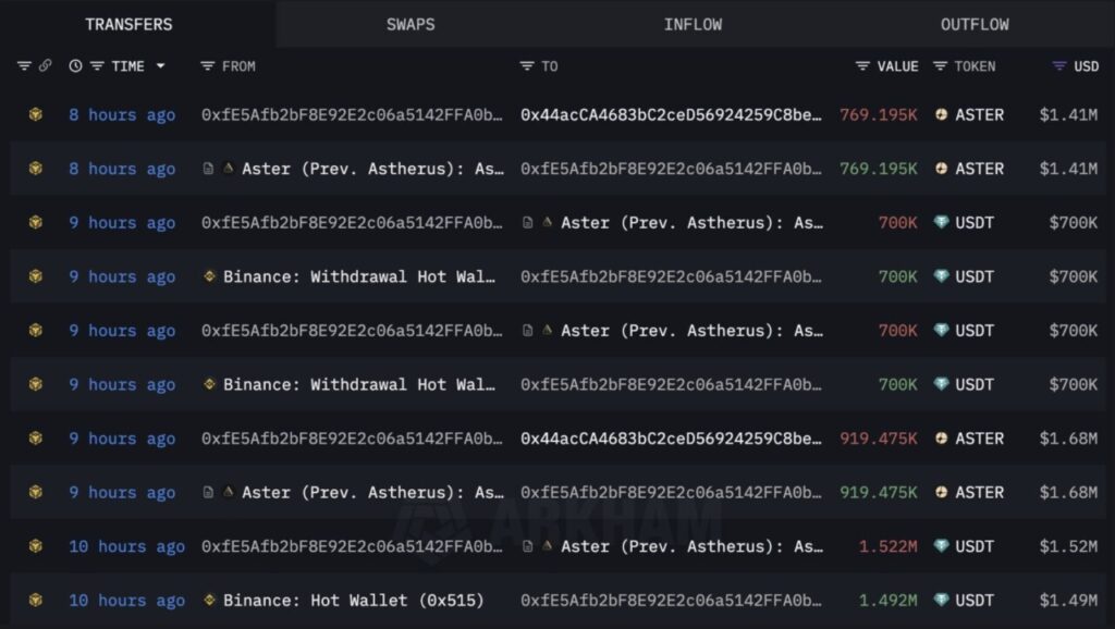 Namun, di tengah tekanan harga tersebut, aktivitas whale terhadap token ASTER justru tetap tinggi. Berdasarkan data dari perusahaan analisis blockchain Arkham Intelligence, seorang investor besar dengan alamat dompet 0xfE5A tercatat membeli 1,69 juta token ASTER senilai sekitar $3,16 juta pada hari ini.