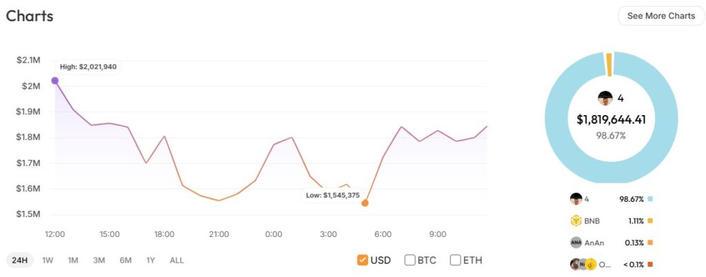 Trader beralamat dompet “0x872” tercatat sebagai salah satu pembeli pertama token “4”. Menurut data CoinStats, investasi awalnya yang hanya senilai $3.000 kini tumbuh menjadi $2 juta, atau naik sekitar 650 kali lipat.