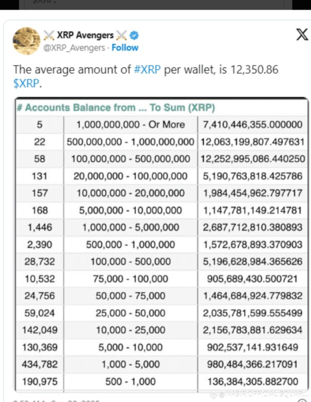 Pembaruan data dari akun analis @XRP_Avengers (28 September 2025) menunjukkan bahwa rata-rata jumlah XRP per dompet kini mencapai 12.350,86 XRP, senilai sekitar $34.700 (Rp575 juta) pada harga $2,81 per XRP.
