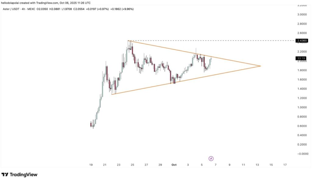 Secara teknikal, ASTER tengah bergerak dalam pola segitiga bullish (bullish triangle pattern) dan kini menguji level resistensi di sekitar $2,43. Jika harga mampu menembus batas ini, Aster berpotensi memasuki fase price discovery, yaitu kondisi di mana harga mencapai level tertinggi baru tanpa acuan sebelumnya.