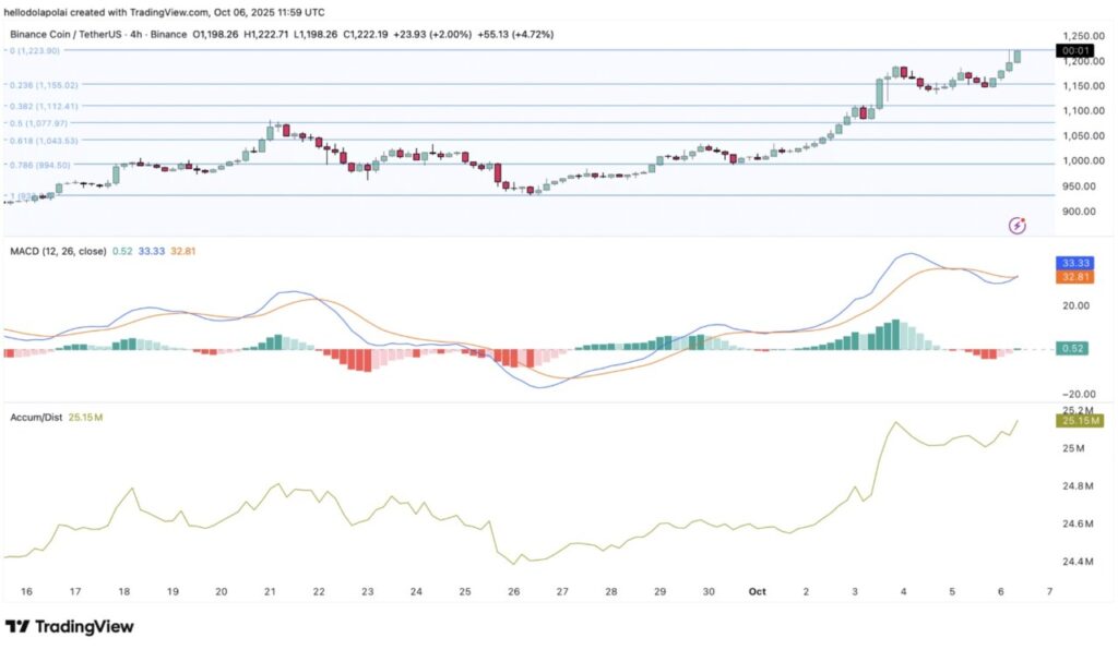BNB terus melanjutkan tren kenaikannya dan kini hanya 0,05% di bawah rekor tertinggi sepanjang masa sebesar $1.220.