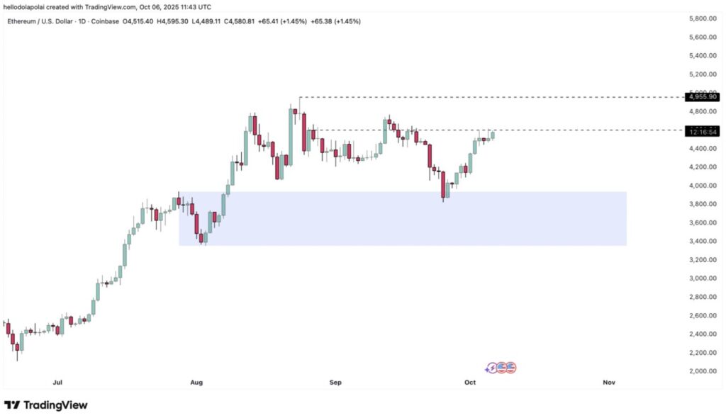 Dengan kapitalisasi pasar mencapai $553,8 miliar, Ethereum tetap menjadi mata uang crypto terbesar kedua di dunia. Pola grafik harga menunjukkan bahwa untuk mengulang rekor tertinggi sepanjang masa dan melampaui ambang $5.000, ETH perlu menembus level resistensi $4.601.