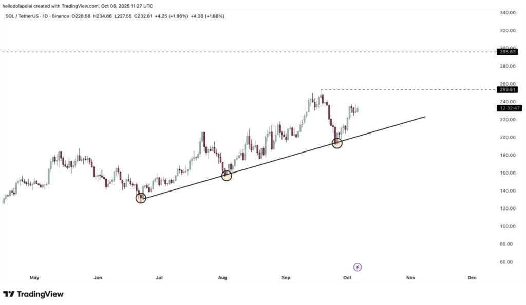 Dari sisi teknikal, harga SOL terus memantul dari garis tren naik (ascending trendline), menandakan adanya dukungan kuat dari pembeli. Jika tekanan beli mampu mendorong harga menembus level $253, maka potensi untuk menguji rekor tertinggi $295 semakin terbuka.