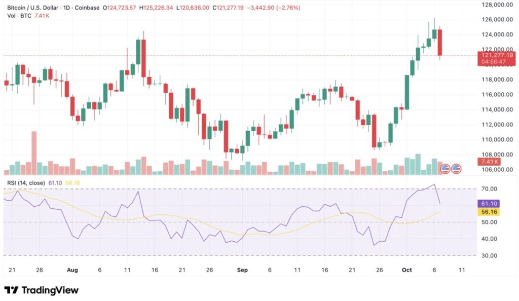 Per 8 Oktober, harga Bitcoin sempat berada di kisaran $121.277, turun sekitar 2,76% dalam 24 jam terakhir setelah sempat menyentuh level tertinggi lokal di sekitar $126.000.