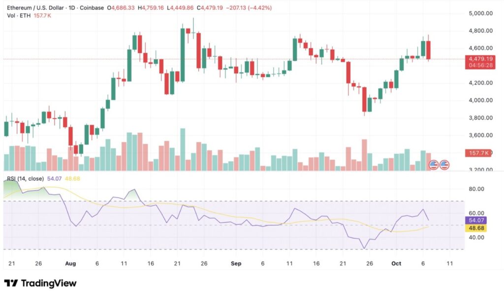 Sementara itu, harga Ethereum juga mengalami penurunan 4,4% ke level $4.479, menandakan fase koreksi ringan setelah awal pekan yang cukup kuat. RSI di level 54,07 menunjukkan momentum yang masih netral, sementara para trader menunggu konfirmasi adanya arus masuk baru dari aktivitas whale.