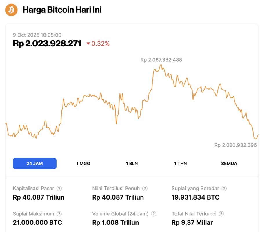 Pada 9 Oktober 2025,Ā harga BitcoinĀ tercatat berada di level $121,957 atau setara dengan Rp2.023.928.271, mengalami penurunan 0,32% dalam 24 jam terakhir. Sepanjang periode ini, BTC menyentuh level terendahnya di Rp2.020.932.396 dan harga tertingginya di Rp2.067.382.488.