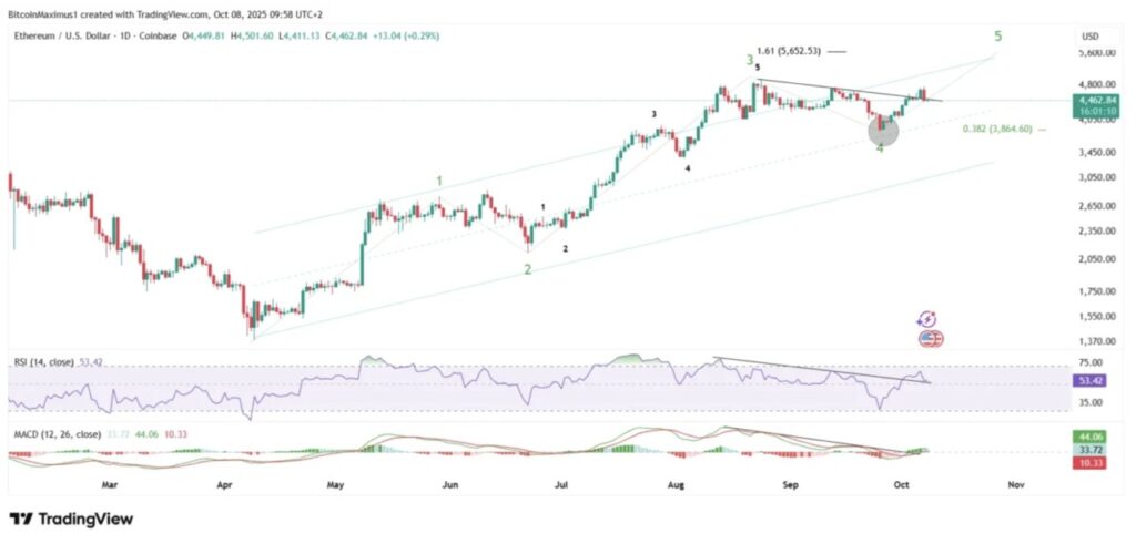 Mengutip laporan CCN, dalam jangka panjang, proyeksi Ethereum tetap bullish selama harga tidak menutup candle di bawah $3.950. Analisis gelombang memperkirakan satu fase kenaikan tambahan yang dapat mendorong harga Ethereum melampaui $5.600.