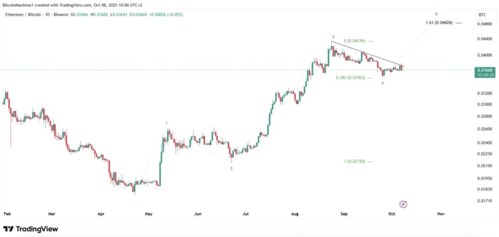 Grafik Ethereum terhadap Bitcoin (ETH/BTC) menunjukkan pola yang sangat mirip dengan grafik ETH terhadap USD, memperkuat pandangan bahwa Ethereum saat ini berada di gelombang kelima dan terakhir dari fase kenaikannya.