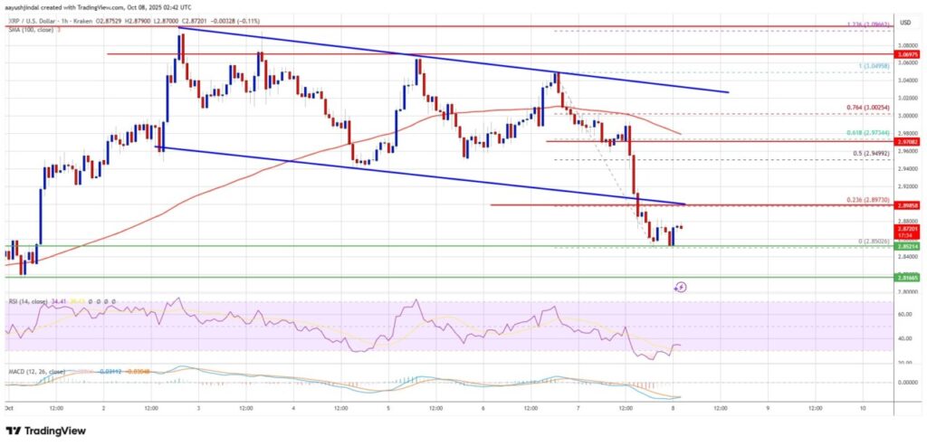 Harga Ripple (XRP) baru-baru ini mengalami penurunan signifikan, di mana ia tidak mampu mempertahankan posisinya di atas $3,020 dan terus menurun di bawah $3,00 dan $2,950. Penurunan ini memasukkan XRP ke dalam zona bearish jangka pendek, yang mungkin berlanjut jika harga tetap di bawah $2,850. Selain itu, terjadi pula pemecahan pada saluran menurun kunci dengan dukungan di $2,90 pada grafik per jam pasangan XRP/USD.