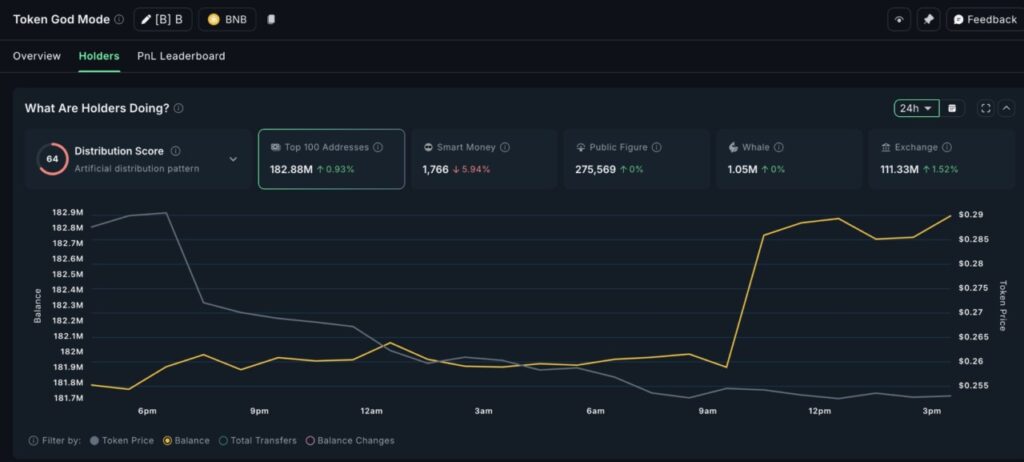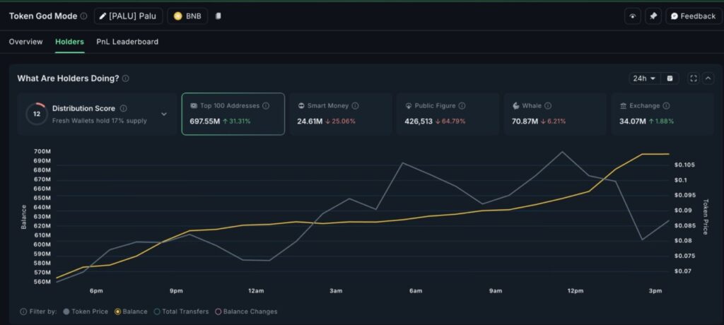Dompet smart money ā yang biasanya merupakan trader aktif jangka pendek ā mengurangi kepemilikannya sebesar 25,06%, menyisakan sekitar 24,61 juta PALU.