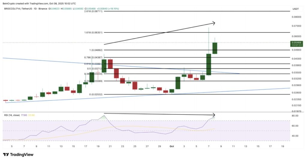 Jika harga berhasil menembus $0,063, BROCCOLI berpotensi melanjutkan reli kuatnya seiring berlanjutnya musim meme coin di jaringan BNB.