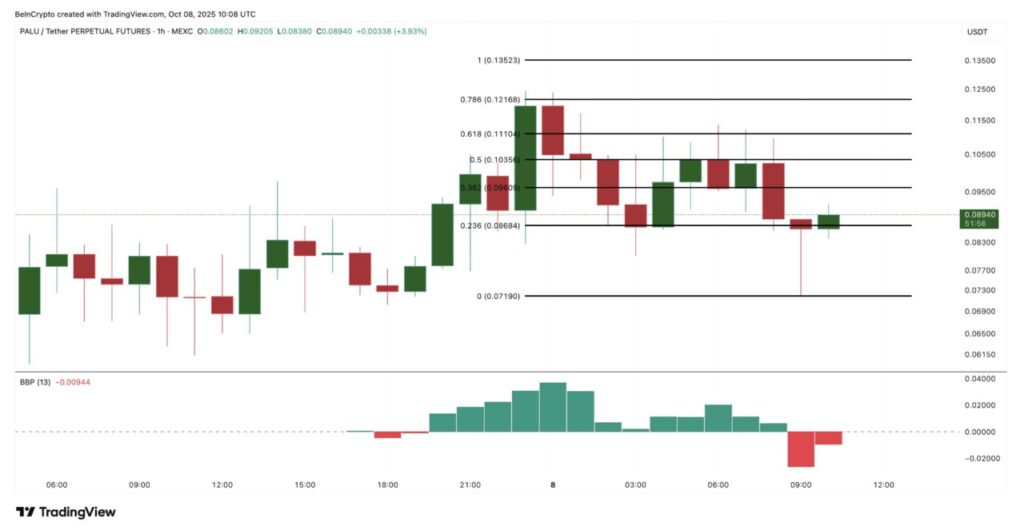 Secara teknikal, pada grafik per jam, PALU sedang menguji area support di $0,086, yang sebelumnya berfungsi sebagai level resistansi penting.