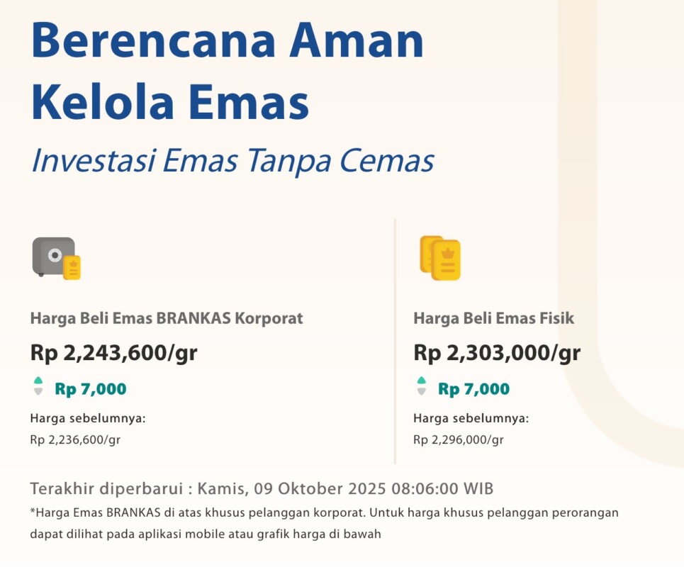 Jakarta, Brankas News ā Harga emas kembali menjadi perhatian para investor, khususnya logam mulia produksi PT Aneka Tambang (Antam) dan layanan penyimpanan emas seperti BRANKAS. Pada Kamis, 9 Oktober 2025, harga beli emas BRANKAS Korporat tercatat naik menjadi Rp2.243.600 per gram, sedangkan harga emas fisik menyentuh Rp2.303.000 per gram.