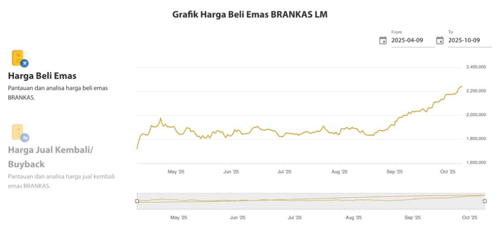 Berdasarkan grafik harga emas BRANKAS LM dari 9 April hingga 9 Oktober 2025, terlihat bahwa harga emas mengalami peningkatan signifikan. Pada awal April, harga masih berada di kisaran Rp1.750.000 per gram, namun mulai Agustus menunjukkan tren bullish.