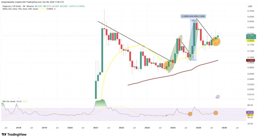 Seperti dilaporkan oleh Cointelegraph, sejumlah indikator on-chain dan teknikal juga mendukung kemungkinan terjadinya reli harga DOGE pada kuartal IV 2025.