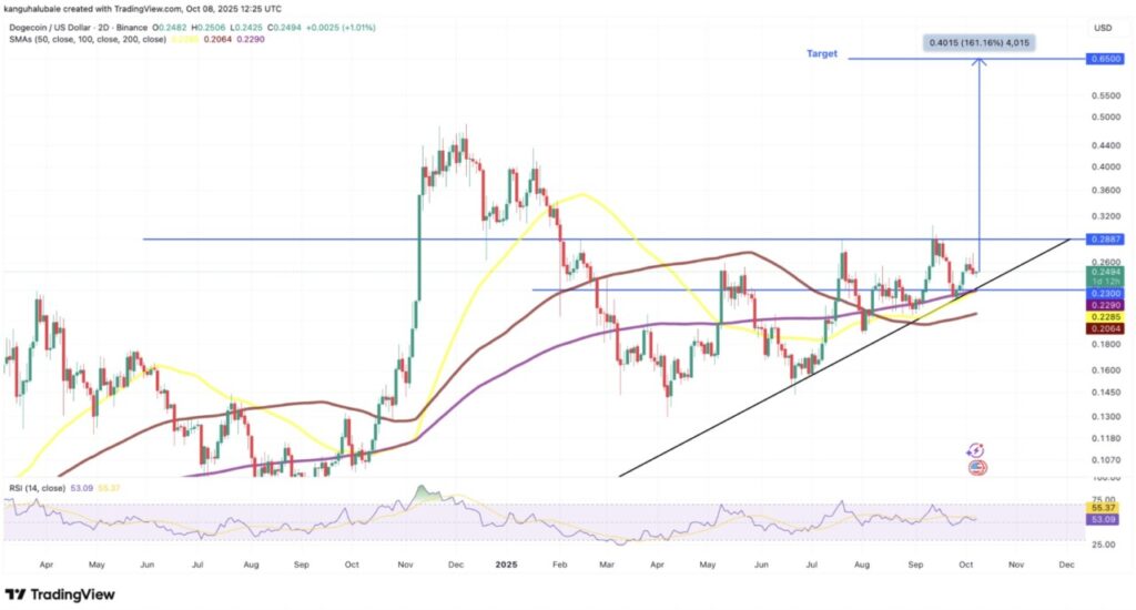 Analis crypto bernama Mags bahkan lebih optimistis terhadap potensi kenaikan yang lebih besar lagi. Ia menyoroti meningkatnya minat institusional dari perusahaan yang memegang kas dalam bentuk Dogecoin, serta kemungkinan persetujuan spot ETF yang diperkirakan terjadi pada pertengahan Oktober.
