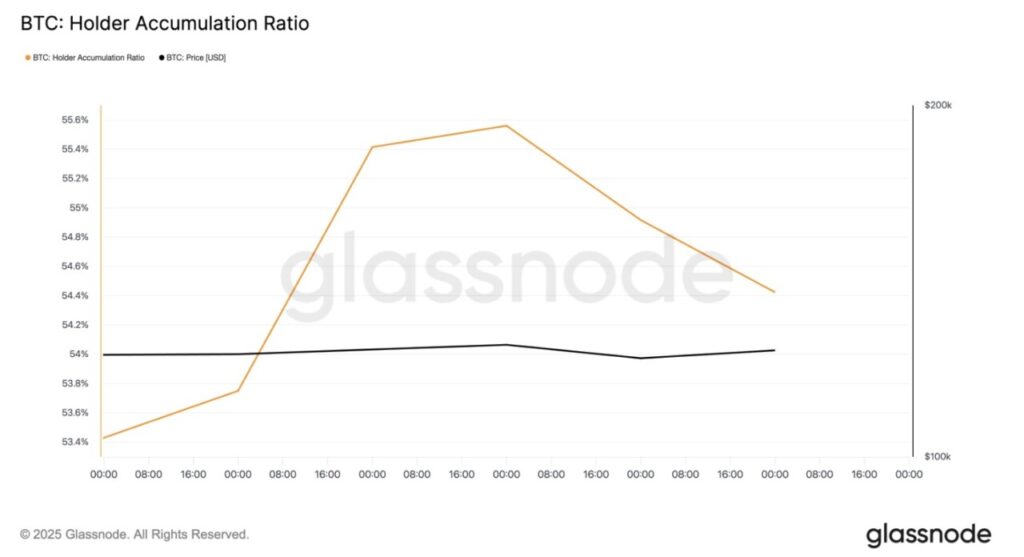Tanda-tanda melemahnya momentum mulai terlihat seiring dengan pergerakan sideways Bitcoin dalam beberapa hari terakhir. Berdasarkan data dari Glassnode, Holder Accumulation Ratio — metrik yang mengukur seberapa banyak investor aktif menambah kepemilikan dibanding yang menguranginya — terus menurun sejak hari Senin.