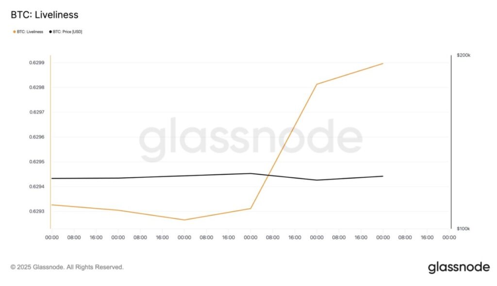 Dalam waktu yang sama, metrik lain yakni BTC Liveliness kembali menunjukkan tren naik sejak Senin, dan tercatat di angka 0,6298 per 8 Oktober. Metrik ini melacak pergerakan token yang telah lama disimpan (long-held/dormant tokens) dengan membandingkan jumlah coin days destroyed terhadap total coin days accumulated.
