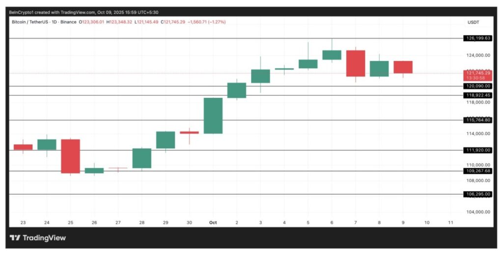 Tanpa adanya minat beli baru, Bitcoin berisiko turun menuju area $120.000. Jika level support di $120.090 berhasil ditembus, maka potensi penurunan lanjutan hingga $118.922 bisa terjadi.