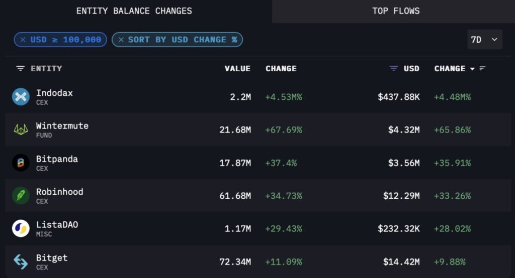 Meskipun terjadi penjualan besar-besaran oleh trader perorangan, laporan dari Arkham Intelligence menunjukkan bahwa entitas kripto besar masih aktif mengakumulasi WLFI. Dalam tujuh hari terakhir, investor terpusat seperti Robinhood, Bitget, Bitpanda, dan Indodax telah menginvestasikan lebih dari $30 juta ke dalam WLFI. Ini menunjukkan bahwa masih ada minat yang kuat dari pemain besar di pasar.