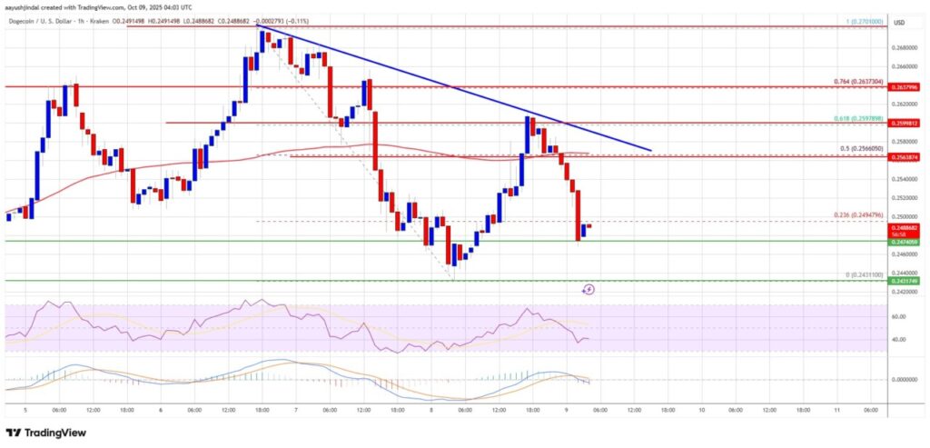 Dogecoin (DOGE) memulai penurunan baru setelah penutupan di bawah $0,2620, mengikuti jejak Bitcoin dan Ethereum . DOGE turun di bawah level dukungan $0,260 dan $0,2550. Bahkan, harga telah diperdagangkan di bawah $0,2450, dengan mencatat titik terendah di dekat $0,2430. Baru-baru ini, DOGE mencoba untuk pulih, namun upaya tersebut terhambat oleh tekanan jual di dekat resistensi $0,260.