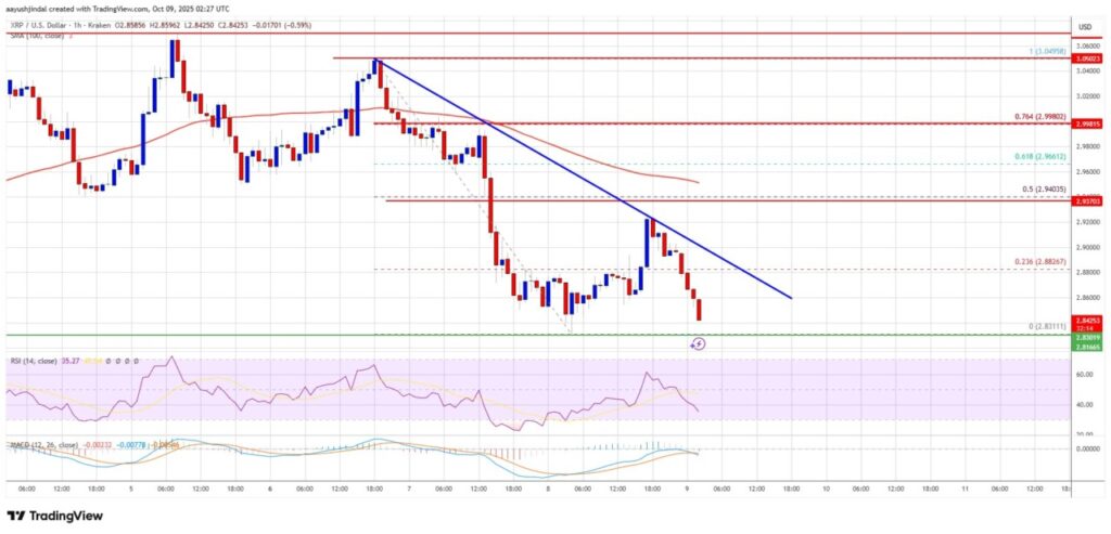 Terdapat garis tren bearish yang terbentuk dengan resistensi di $2,88 pada grafik per jam pasangan XRP/USD. Jika harga mencoba naik lagi, kemungkinan akan menghadapi hambatan kuat di level ini sebelum bisa mencoba menembus lebih tinggi.