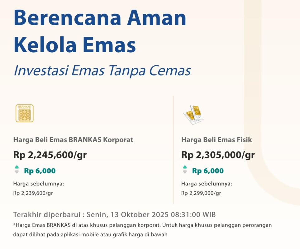 Jakarta, 13 Oktober 2025 — Harga emas kembali mendapat sorotan, khususnya dari platform BRANKAS LM, yang mencatat kenaikan harga pada kategori emas korporat dan emas fisik.