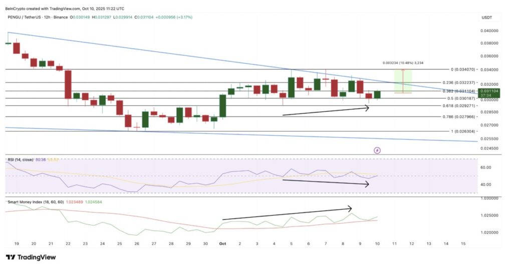 Dari sisi teknikal, PENGU saat ini diperdagangkan dalam pola falling wedge, yaitu pola grafik bullish yang sering mengindikasikan akhir dari tren penurunan. Antara 4 hingga 9 Oktober, token ini membentuk higher low, sementara Relative Strength Index (RSI) justru mencetak lower low, membentuk hidden bullish divergence yang mendukung skenario pemulihan harga.