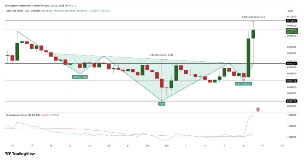 Pada grafik 12 jam, ZORA telah menembus pola inverse head and shoulders (kepala dan bahu terbalik), melewati garis leher di kisaran $0,06. Pergerakan ini mengonfirmasi breakout, dan kini harga token diperdagangkan mendekati $0,09. Berdasarkan proyeksi pola tersebut, ZORA masih memiliki potensi naik menuju zona $0,10 — sekitar target kenaikan 53% dari garis leher.