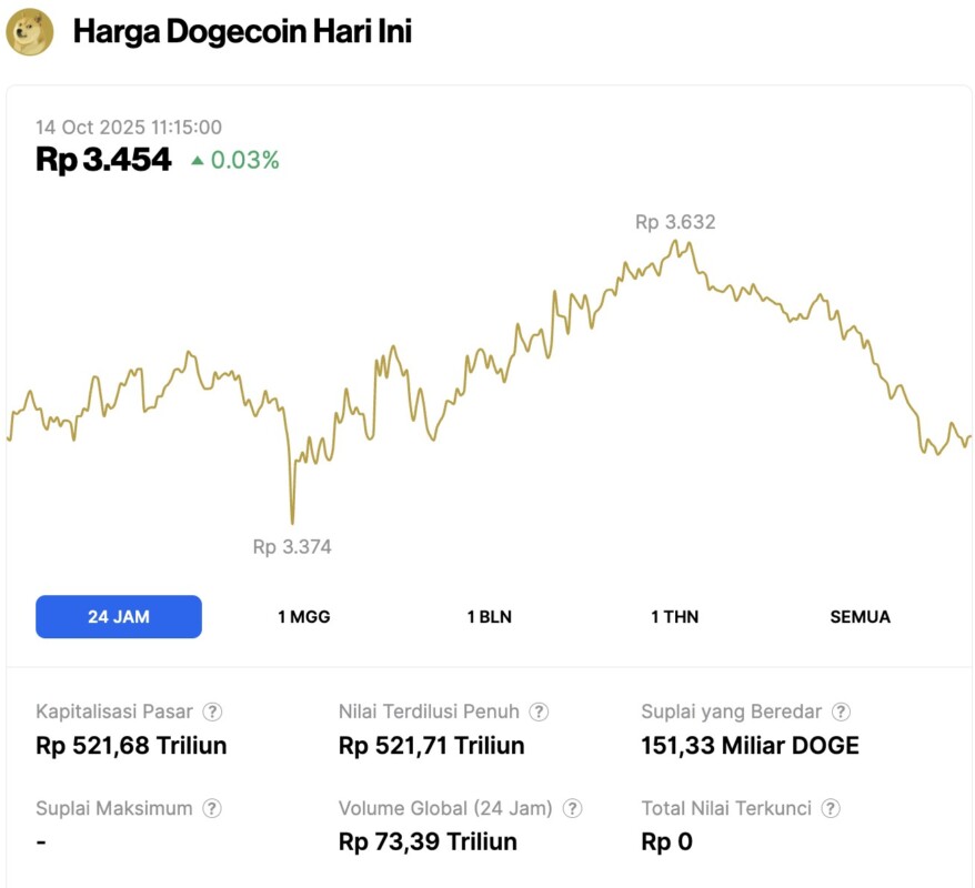 Pada 14 Oktober 2025, harga Dogecoin tercatat mengalami kenaikan tipis 0,03% dalam waktu 24 jam, diperdagangkan pada harga $0.2080 atau setara dengan Rp3.454. Dalam periode 24 jam terakhir, harga DOGE bergerak dalam kisaran Rp3.374 hingga Rp3.632.