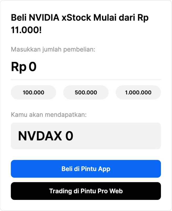 Jadi, buat kamu yang bertanya “beli saham NVIDIA di mana?”, jawabannya: kamu bisa menggunakan aplikasi investasi seperti Pintu, yang menyediakan saham dalam bentuk aset digital (XStocks) seperti NVDAX.