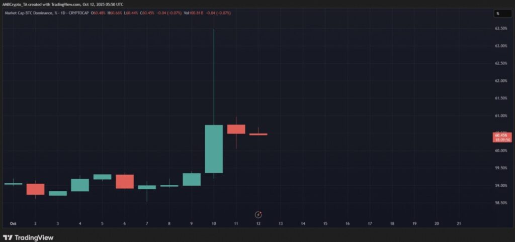 Dominasi pasar Bitcoin (BTC.D) turun ke angka 60,45% saat artikel ini ditulis, melunak setelah lonjakan tajam yang terjadi awal pekan ini. Angka tersebut mencerminkan ketidakpastian di pasar, dengan momentum yang mulai melemah usai lonjakan kuat pada 10 Oktober lalu.