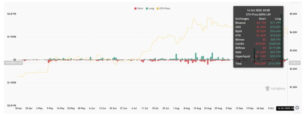 Penurunan harga Ethereum hari ini disertai dengan likuidasi besar-besaran di pasar crypto. Menurut data dari CoinGlass, lebih dari $650 juta posisi kripto dengan leverage telah dilikuidasi dalam 24 jam terakhir (14/10), dengan $455 juta berasal dari likuidasi posisi long. Likuidasi posisi long Ether sendiri mencapai $114,5 juta, dan jumlah ini terus bertambah saat laporan ini dibuat.