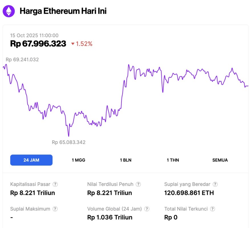 Pada 15 Oktober 2025, harga Ethereum tercatat berada di sekitar $4,084 atau setara dengan Rp67.996.323, mengalami penurunan 1,52% dalam 24 jam terakhir. Sepanjang periode ini, ETH sempat menyentuh level terendahnya di Rp65.083.342, dan level tertingginya di Rp69.241.032.
